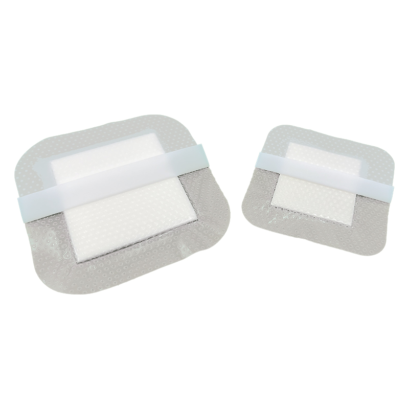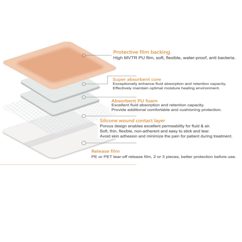 תחבושת קצף סליקון עם שוליים היא חבישה נדבקת עצמית עם קצה גבול נוסף המורכב מגב פלם מגן, ליבה סופר סופגת, קצף PU סופג, שכבת מגע פצעי סייקון ופים שחרור.