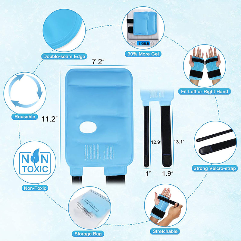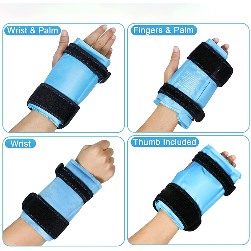 בצע דחיסה קרה עם הרצועה האלסטית כדי לעטוף את פרק כף היד הפצוע כדי לעזור להאיץ את ההתאוששות מתסמונת התעלה הקרפלית והתאוששות לאחר ניתוח, להפחית חבורות ונפיחות הקשורות לפציעות ספורט, ולהקל על כאבי מפרקים כרוניים. ישנן 4 שיטות לשימוש בחבילת הקרח, ממוקדות לאצבעות ולשורש כף היד. כדי למנוע דליפת ג'ל, עטיפת הקרח בפרק כף היד מיישמת טכנולוגיית תפר כפול כדי לאטום את קצה שקית הקרח.