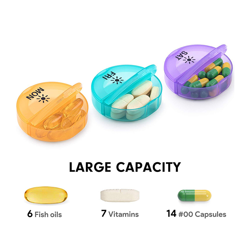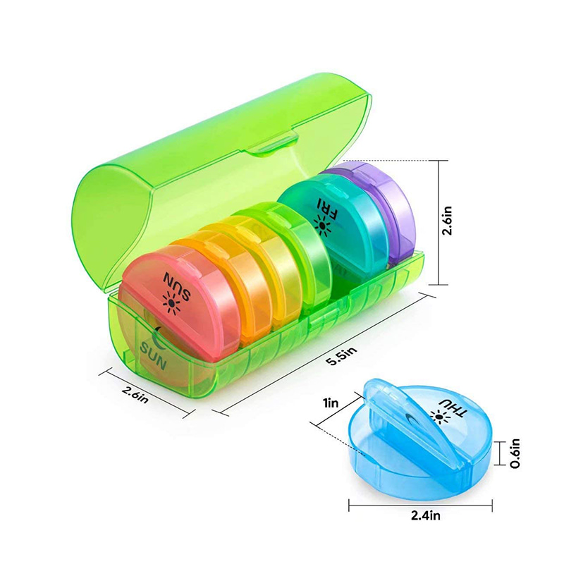 7 קופסאות יומיות בודדות של 7 צבעים מאפשרות לך להחליק החוצה יחיד או כמה ימים של תרופה לקחת כשאתה בחוץ.