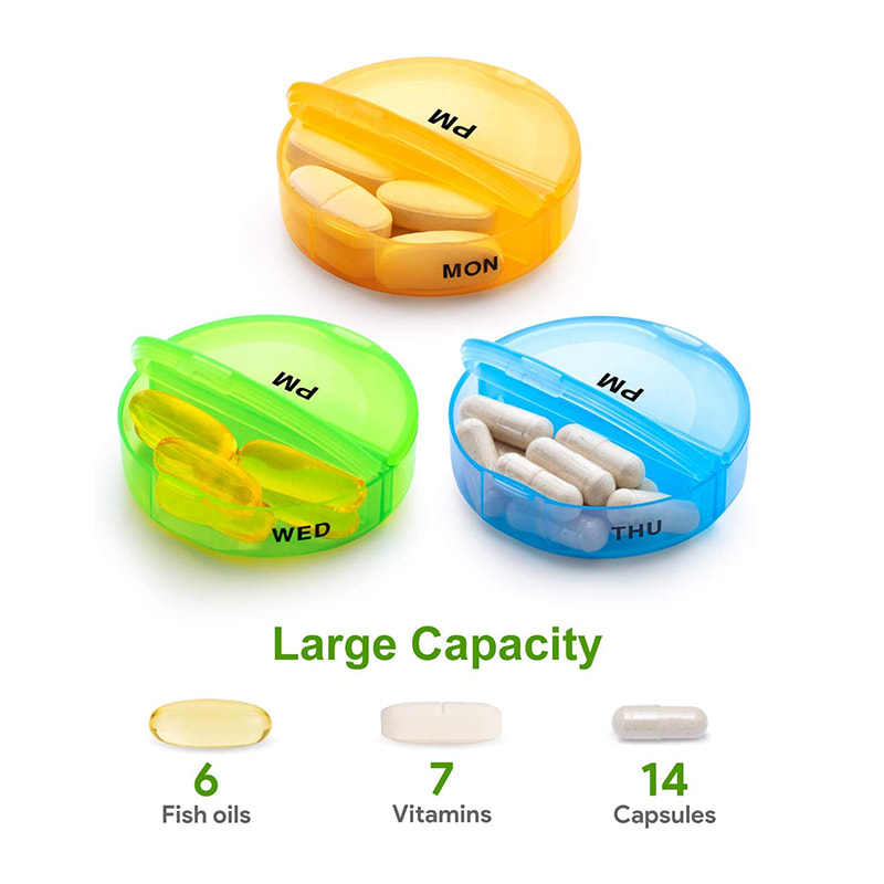 ארגונית קופסת הגלולות היומית ניתנת להסרה וכוללת 7 תאים גדולים שגודלם ככף היד.