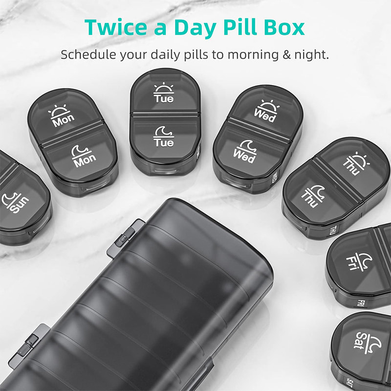 בכל תא יש חלקי AM/PM בוקר לילה. קופסת גלולות זו עוזרת לעקוב אחר הגלולות והתוספים שלך.