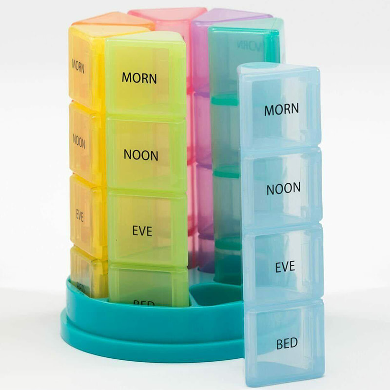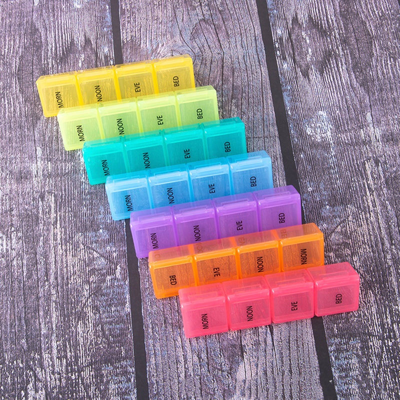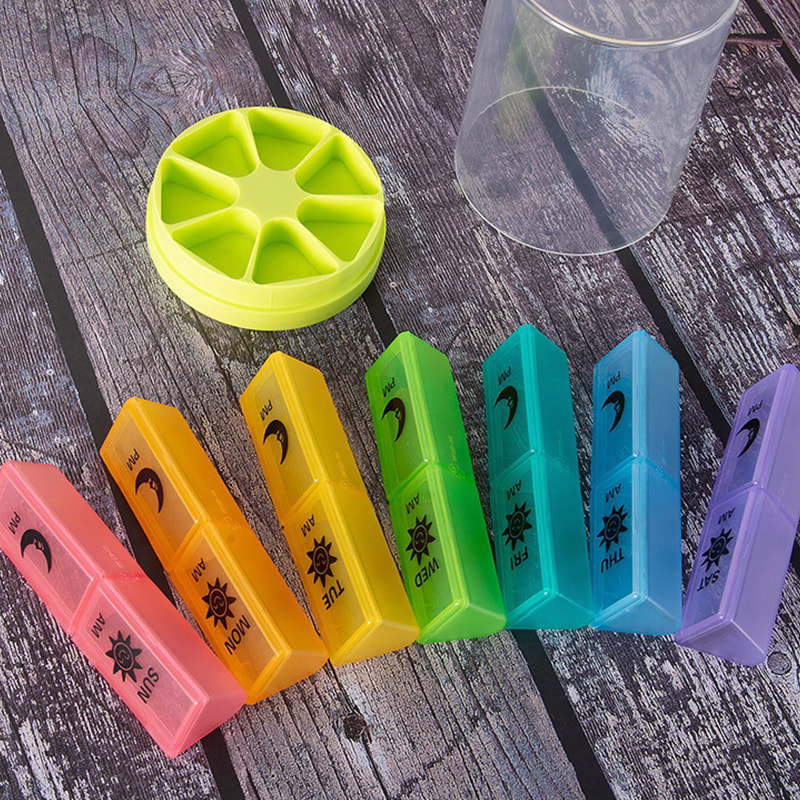 כל קופסת תרופות קומפקטית מודפסת עם סמלי תאריך ושעה של השבוע, וניתן להבחין בקלות בכל קופסת גלולות שבועית על ידי 7 צבעים שונים.