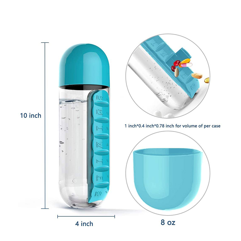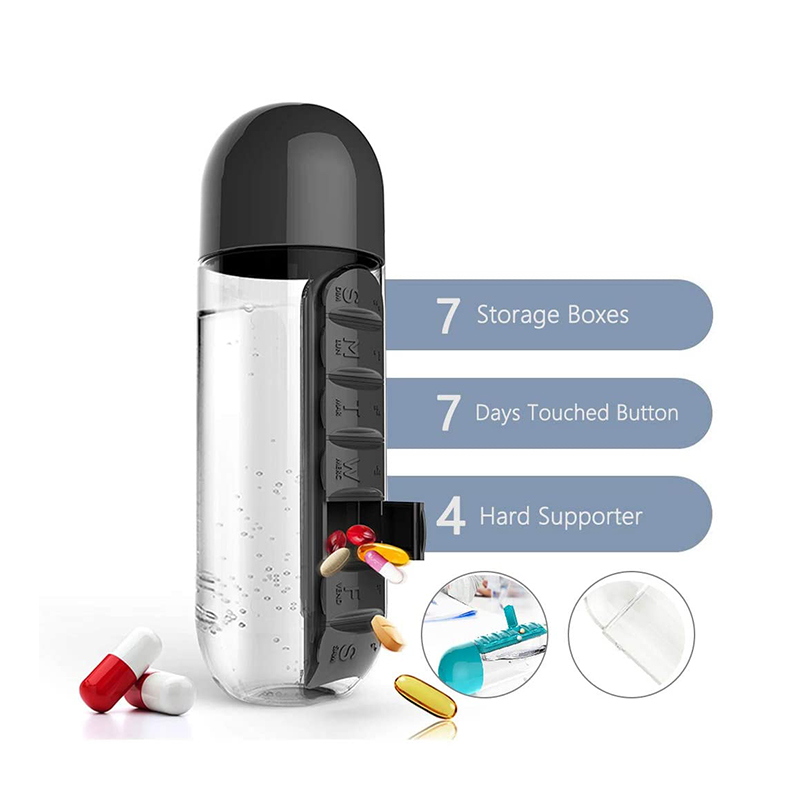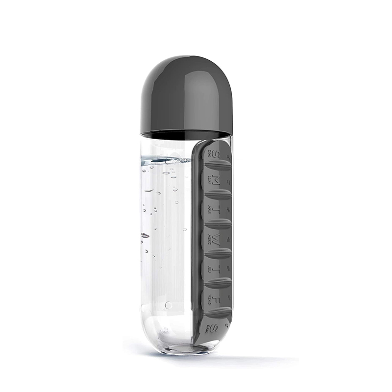 דור שלישי לבקבוק מים בעיצוב חדש עם מארז גלולות, קיבולת של 20 אונקיות.