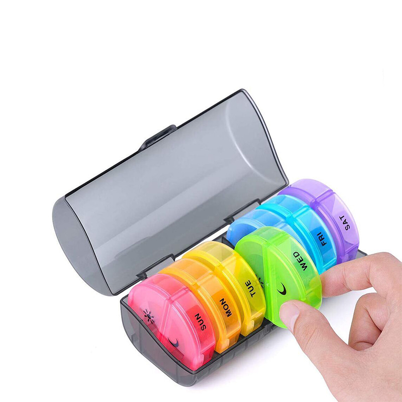 7 קופסאות יומיות בודדות של 7 צבעים מאפשרות לך להחליק החוצה יחיד או כמה ימים של תרופה לקחת כשאתה בחוץ.