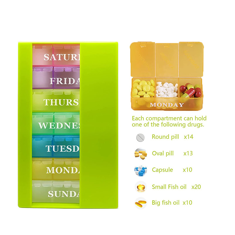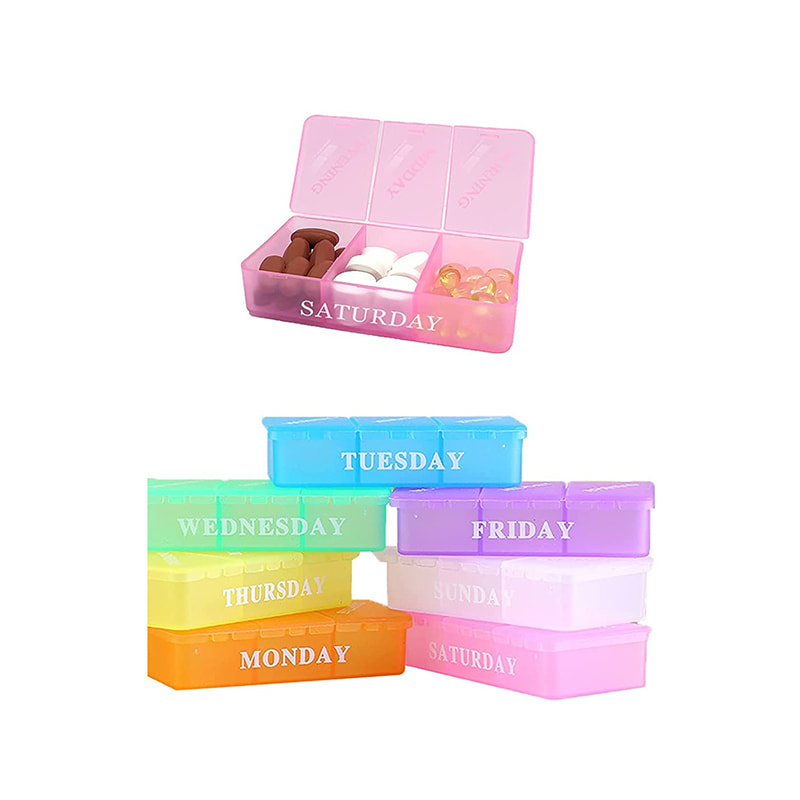 למנהל הגלולות שלוש פעמים ביום יש 21 תאים, עם 7 צבעים שונים ותוויות יום בשבוע.
