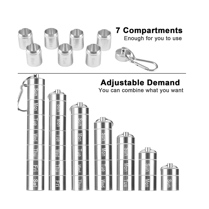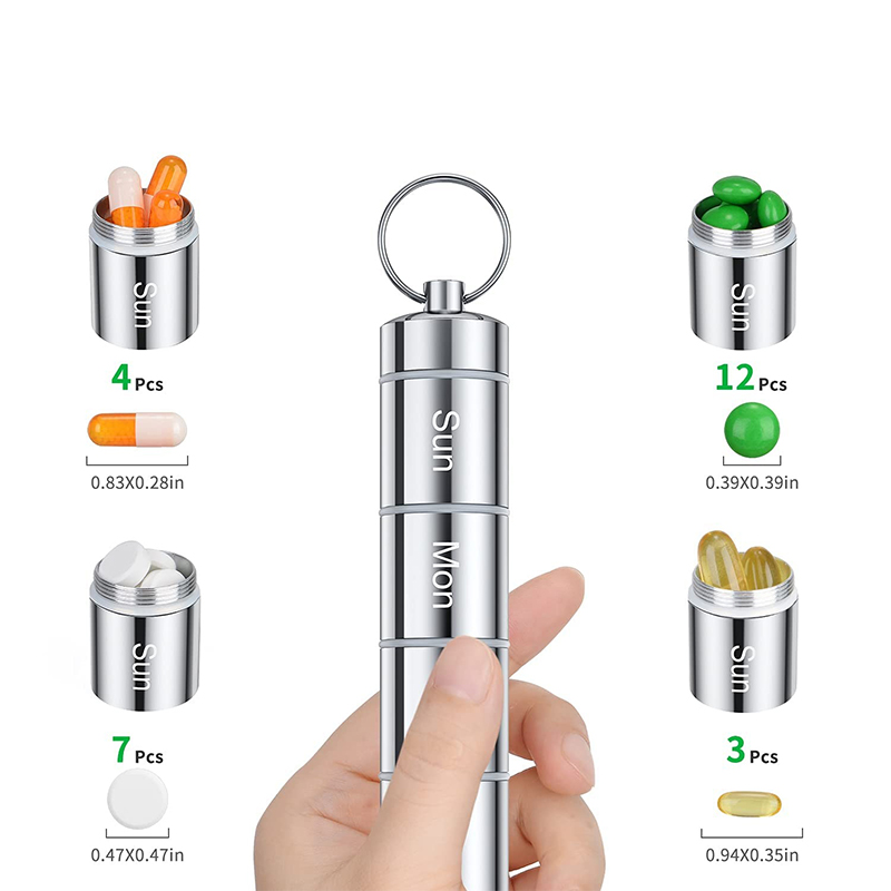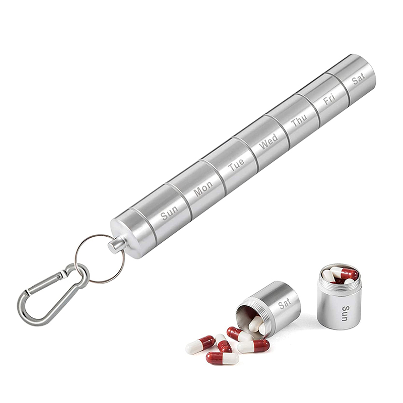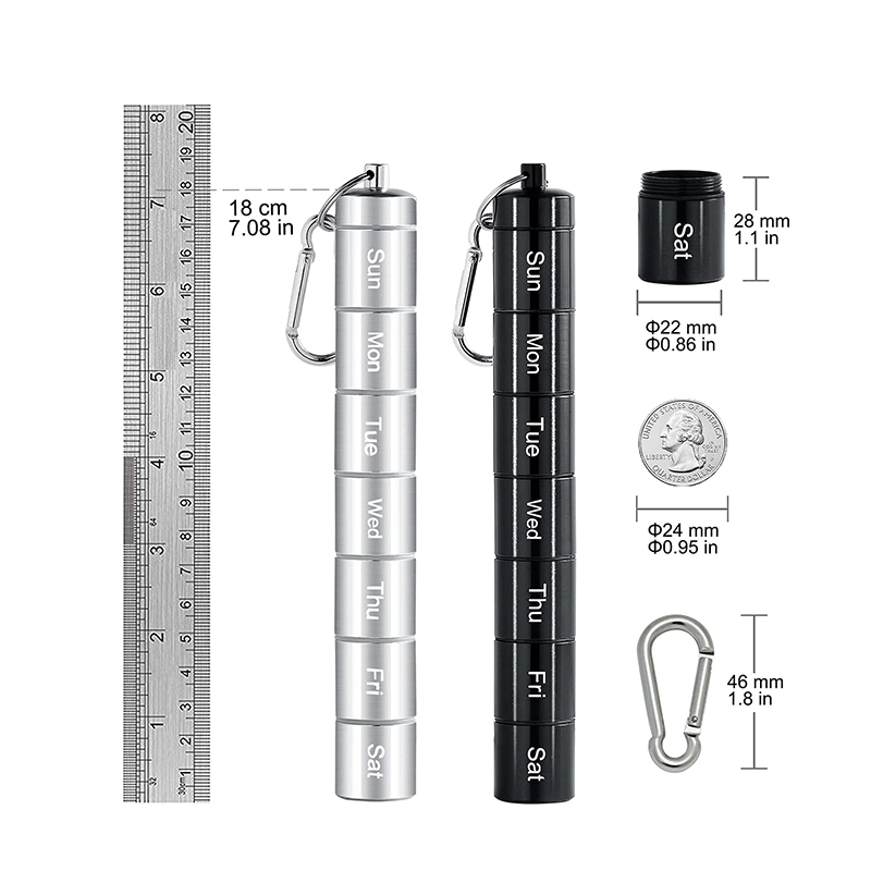 לכל מארז גלולות שבועי יש מחזיק מפתחות ואבזם טיפוס הרים כך שניתן לתלות על מחזיק המפתחות או התיק, קל לנשיאה, עם עיצוב טבעת איטום סיליקון, הם עמידים בפני לחות ועמידים למים